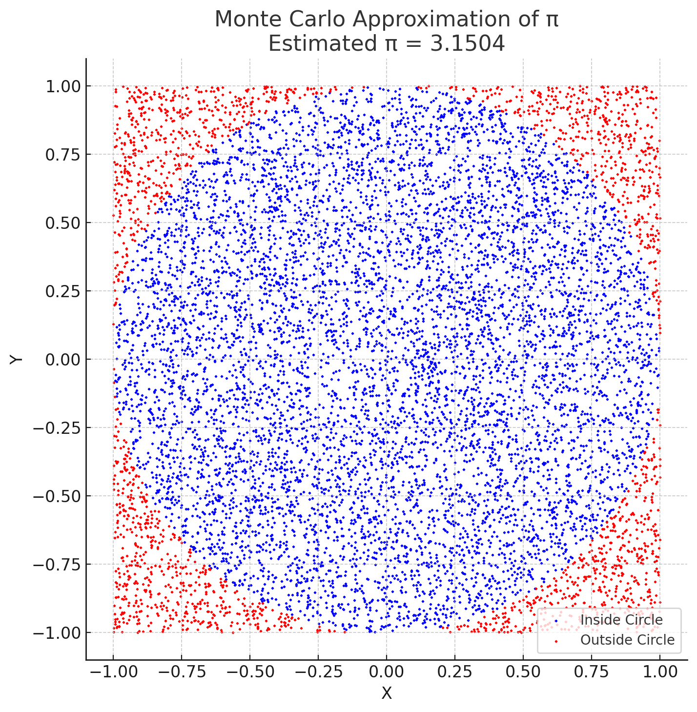 円の内部にある点の数を \( N_{\text{inside}} \)、全体の点の数を \( N_{\text{total}} \) とすると、円の面積と正方形の面積の比率は次のようになります。 \[ \frac{\pi}{4} \approx \frac{N_{\text{inside}}}{N_{\text{total}}} \] よって、これを用いてπの近似値を求めることができます。 \[ \pi \approx 4 \times \frac{N_{\text{inside}}}{N_{\text{total}}} \]