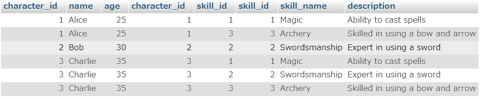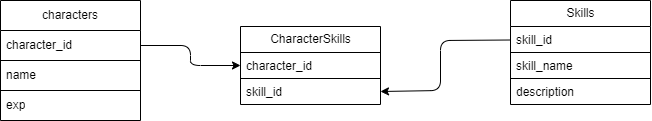 INSERT INTO character_skills (character_id, skill_id) VALUES (1, 1);