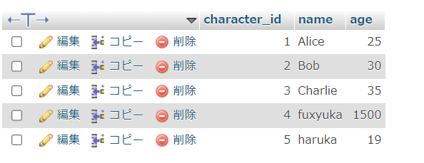 とりあえずcharactersテーブルの中身を見てみましょう。