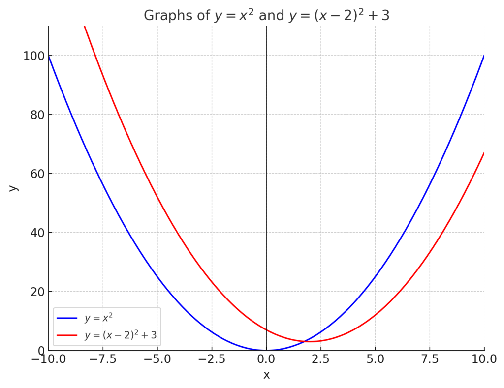 両方を組み合わせて、y 軸方向に 3 だけ上に、x 軸方向に 2 だけ右に移動すると、次のような式になります。