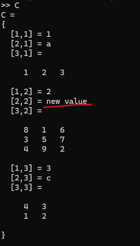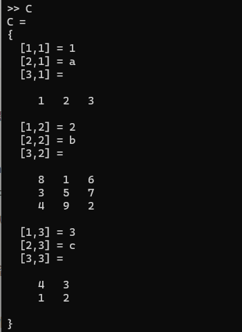 C = {1, 2, 3; 'a', 'b', 'c'; [1, 2, 3], magic(3),magic(2)};