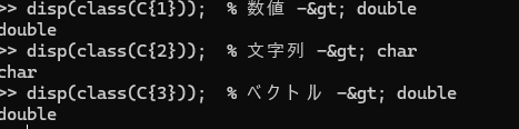disp(class(C{3})); % ベクトル -> double