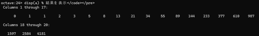 Octaveで$a_{20}$までのフィボナッチ数列を計算しなさい。フィボナッチ数列の漸化式は次のようになっているとする。