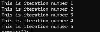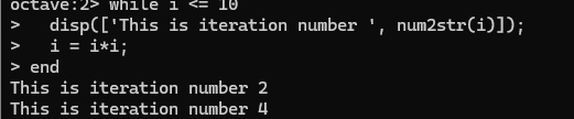 このスクリプトは、i が 1 から 5 までの値を取るごとに、ループの中の処理を実行します。disp 関数を使って現在のイテレーション番号を表示しています。