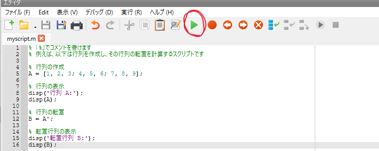 % 例えば、以下は行列を作成し、その行列の転置を計算するスクリプトです