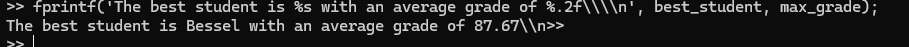 fprintf('The best student is %s with an average grade of %.2f\\\\n', best_student, max_grade);