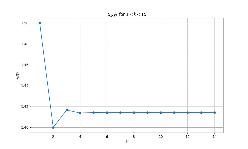 したがって、$\displaystyle\lim_{n\rightarrow\infty}\displaystyle\frac{x_{n}}{y_{n}}=\sqrt{2}$