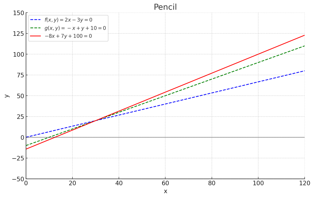 が成り立ちます。したがって、交点\((p, q)\) は必ず \(s f(x, y) + t g(x, y) = 0\) を満たし、交点が複数ある場合は同様の議論をしたらよい。つまり、交点は必ずこの式が表す図形上に含まれることが示されました。