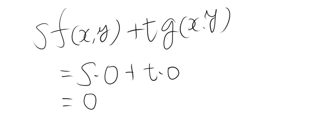 \[ s f(p, q) + t g(p, q) = s \cdot 0 + t \cdot 0 = 0 \]