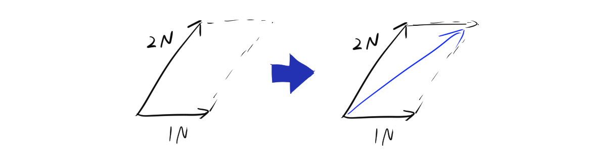 例えば、次のような1Nと2Nの力が与えられていたとします。ベクトルの加法より、平行四辺形を考えて合力を考えます。