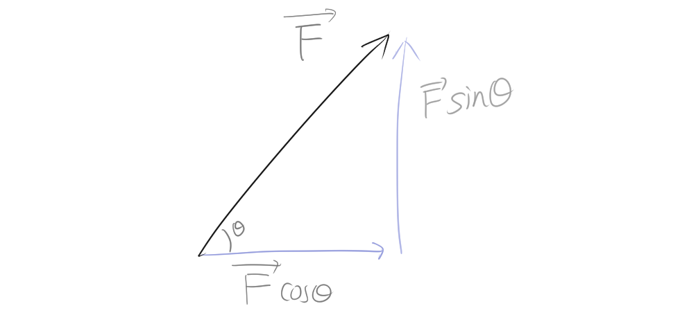 具体的には、\(\overrightarrow{F}\) を角度 \(\theta\) を基準に、x軸方向に \(\overrightarrow{F}\cos\theta\) の力、y軸方向に \(\overrightarrow{F}\sin\theta\) の力に分解することができます。これにより、元のベクトルが二つの直交する力の成分に分かれることになります。