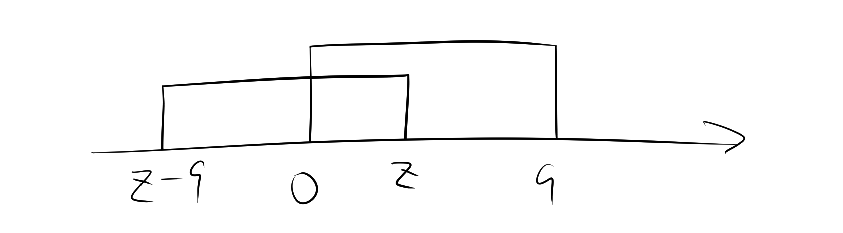 \[ f_Z(z) =\frac1{81}\int_{z-9}^{9}dx =\frac{18-z}{81} \]