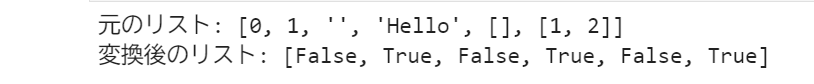 bool()関数を使ってリスト内の各要素をTrueまたはFalseに変換します。map()関数を使用して、リスト全体に対してbool()を適用します。