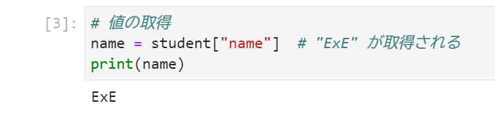 name = student["name"] # "ExE" が取得される