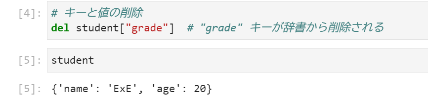 del student["grade"] # "grade" キーが辞書から削除される