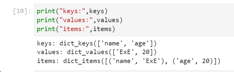 keys(): 辞書のすべてのキーを取得します。values(): 辞書のすべての値を取得します。items(): 辞書のすべてのキーと値のペアを取得します。