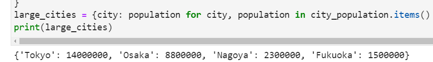 - 条件(人口が 1,000,000 以上)に一致する項目を新しい辞書に追加する。