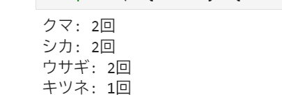 - 空の辞書を作成し、動物の名前をキーとして、その出現回数を値として保持します。