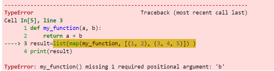 TypeError: my_function() missing 1 required positional argument: ‘b’のエラーは、map関数を使用している際に、my_function関数に必要な引数が不足しているために発生しています。具体的には、my_functionは2つの引数(aとb)を必要としますが、map関数に渡されているリストのタプルの数が異なるため、my_functionに正しい数の引数が渡されていません。今回の場合は2つ必要であるが、リストの中に二つのsetがあるため、引数にはひとつしか入っていることになっている。