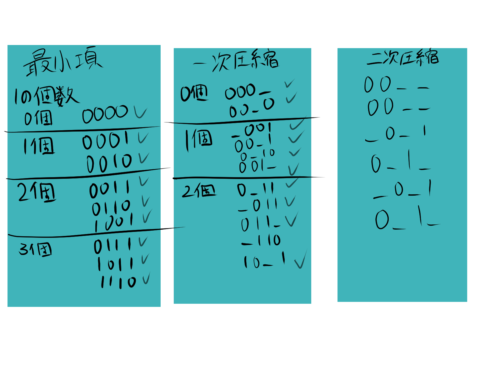 ハミング距離が1である数を選択して、圧縮を行う。ハミング距離が1である数は例えば100と110が挙げられ、圧縮を行うと1_0とする。このような1bitだけ違う(先ほどの例だと真ん中の部分)数をハミング距離が1であるという。また、圧縮した部分は $\mathrm{_}$ で表記して、チェックをつける。