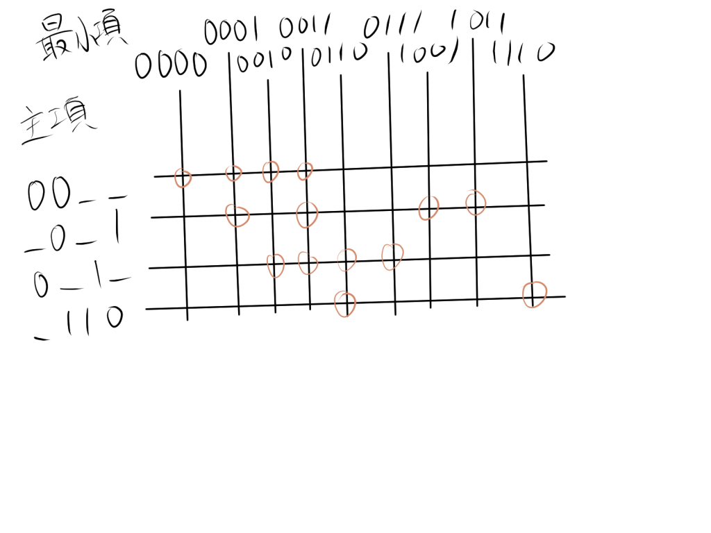 よって、主項はチェックマークのついていないものであるから、00__、0_1_、_0_1、_110であることが分かった。