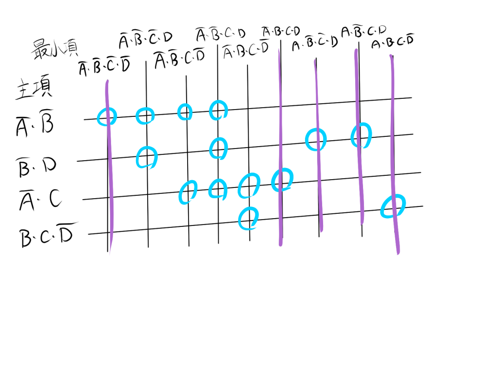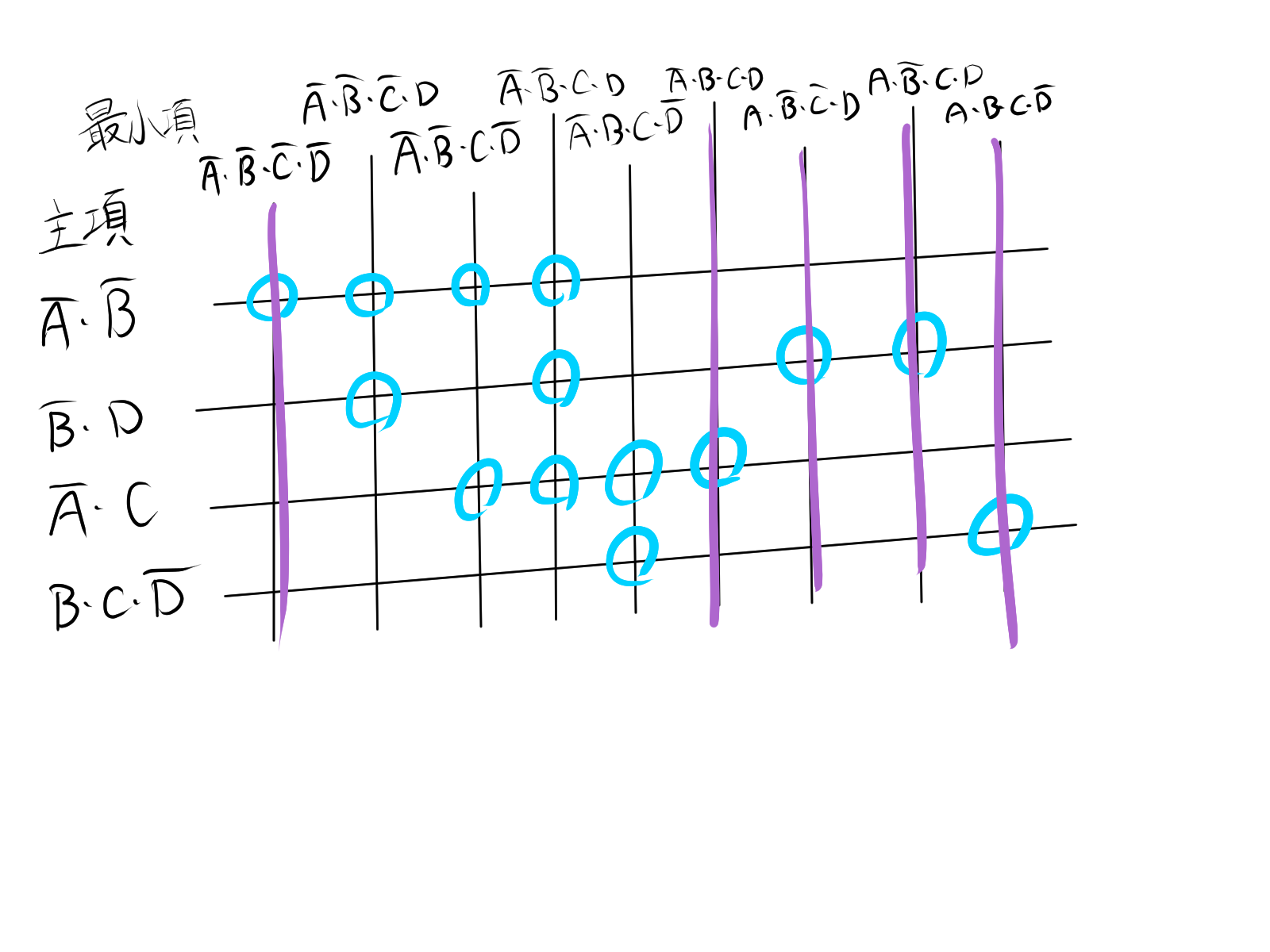 表の列に関して〇が一つしか含まれていない部分は必ず必要な部分であるから、その部分を紫色の線で引く。紫色の線上の〇のある行の主項が最簡形の論理式の一つであるから、最簡形は以下のようになります。