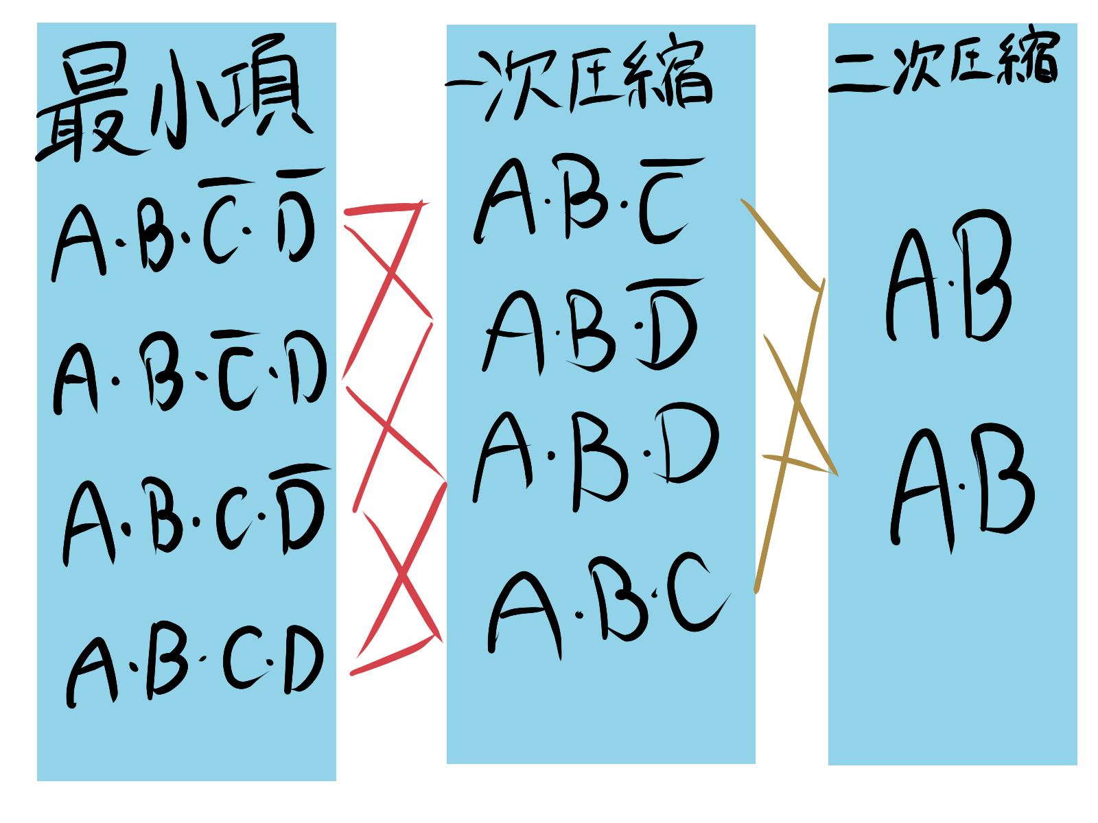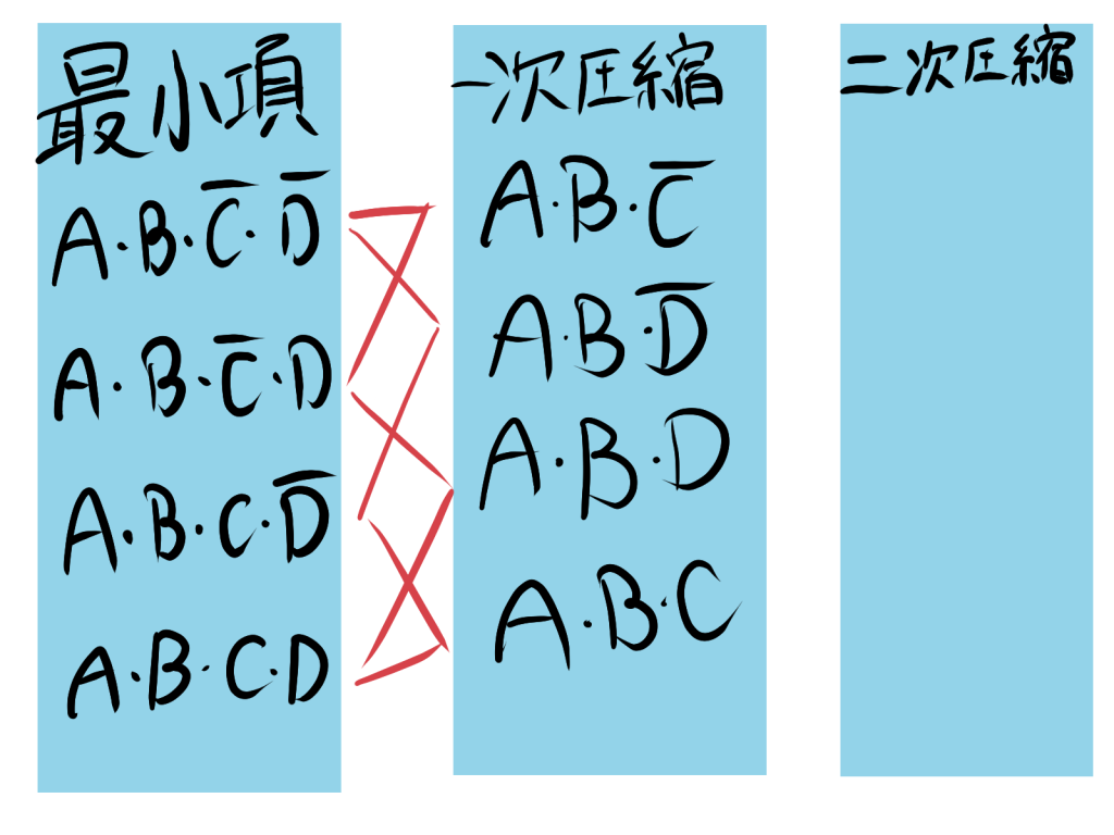 各項に対して、$A\cdot(B+\overline{B})=A$のように圧縮を行います。例えば、最小項の内、$A\cdot B\cdot C\cdot D$と$A\cdot B\cdot C\cdot\overline{D}$を圧縮すると、$A\cdot B\cdot C$となります。圧縮はできなくなるまで行います。まず、1次圧縮を行うと以下のようになる。