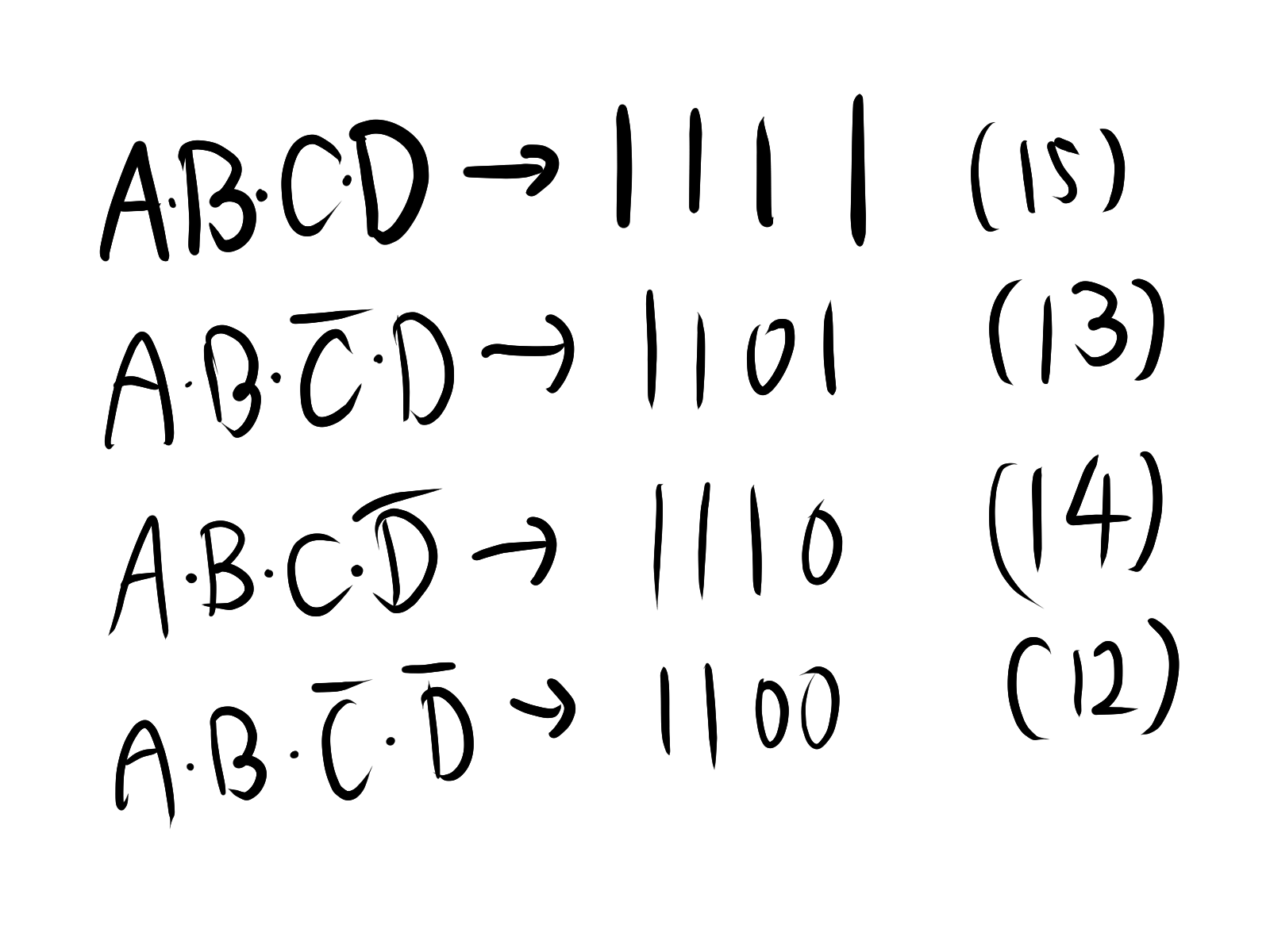 $$Y=A\cdot B\cdot C\cdot D+A\cdot B\cdot\overline{C}\cdot D+A\cdot B\cdot C\cdot\overline{D}+A\cdot B\cdot\overline{C}\cdot\overline{D}$$