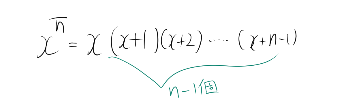 $x^{\overline{n}} $のイメージはxに対して$n-1$個だけプラスにずらした積を計算するという感じです。