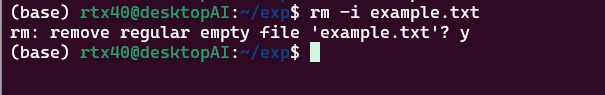 ファイルやディレクトリを削除する際に、確認を求めるようにすることも可能です。-i オプションを付けると、削除前に「本当に削除してよいか?」と確認が求められます。