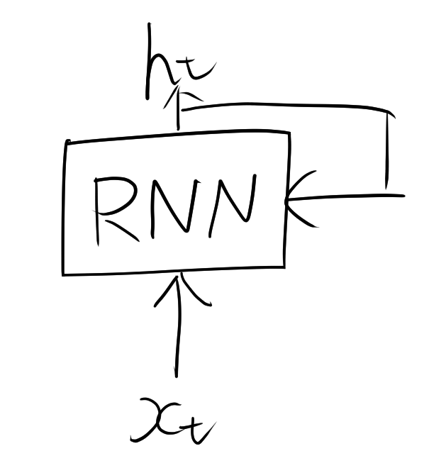 RNNは、入力データを順番に1つずつ処理しながら、内部に「隠れ状態(hidden state)」を持つ構造となっていて、次のようなループの構造を持っています。
