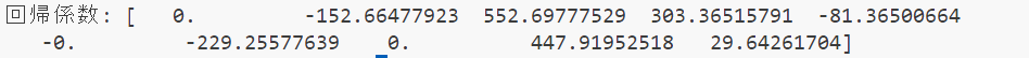 ラッソ回帰では、一部の特徴量の係数がゼロになっていることがわかります。これがラッソ回帰の特徴であり、不要な特徴量をスパース化(ゼロ化)して特徴量を減らしてくれます。