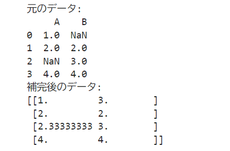 NaNを除いたAのデータの平均は$\frac{1+2+4}{3}=\frac{7}{3}$であるので、2.3333がNaNに入ります。一方で、NaNを除いたBのデータの平均は$\frac{2+3+4}{3}=3$であるので、3がNaNに入ります。