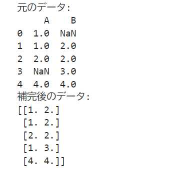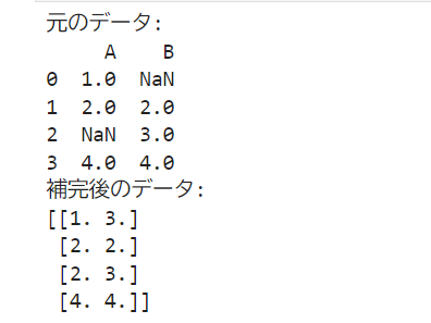 このコードでは、欠損値を含むデータフレームを作成し、SimpleImputerのstrategyを'mean'に設定してインスタンス化します。その後、fit_transformメソッドを使ってデータ内の欠損値を各列の平均値で補完します。