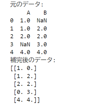 ここでは、strategyを'constant'にし、fill_valueに0を設定することで、欠損値を0で補完しています。