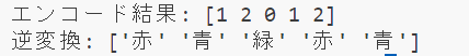 以下のように、カテゴリ「赤」「青」「緑」がそれぞれ数値に変換され、逆変換も可能です。