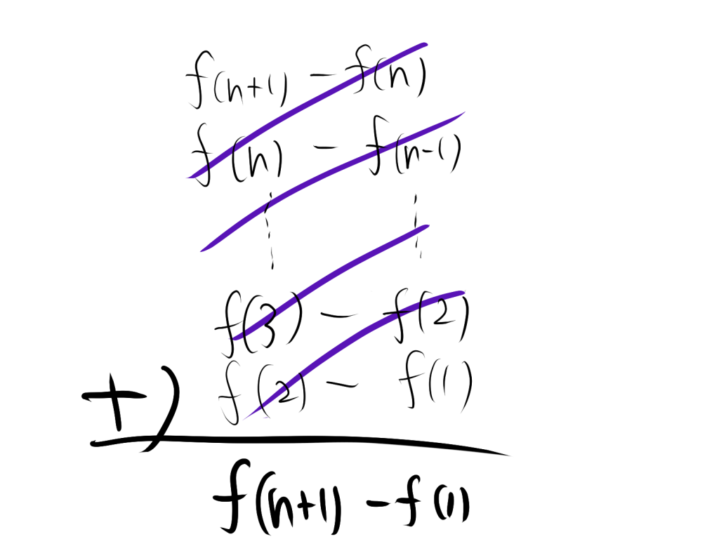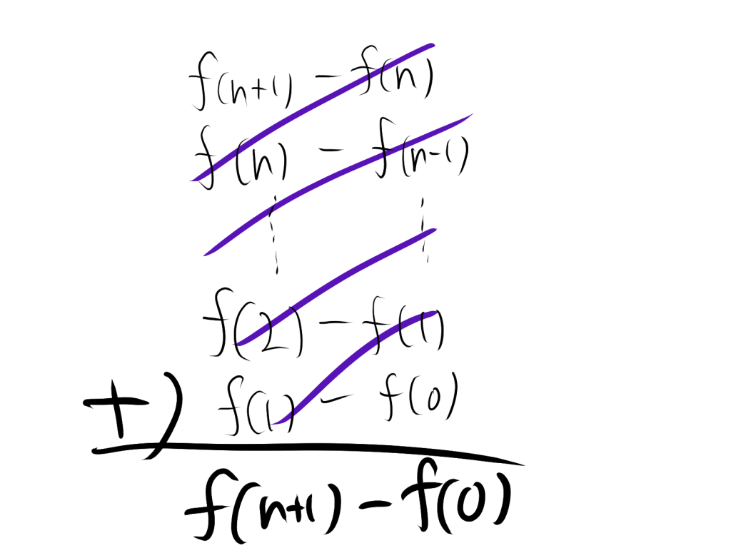 以下のように足し合わせた結果、打ち消しあって、残った部分が$f(n+1)-f(0)$となります。