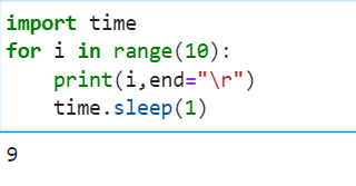 一方このコードは、0から9までの数値を1秒ごとに更新しながら、同じ行に表示し続けるプログラムです。そのため、最初に0が表示されて1秒後に1に更新されます。
