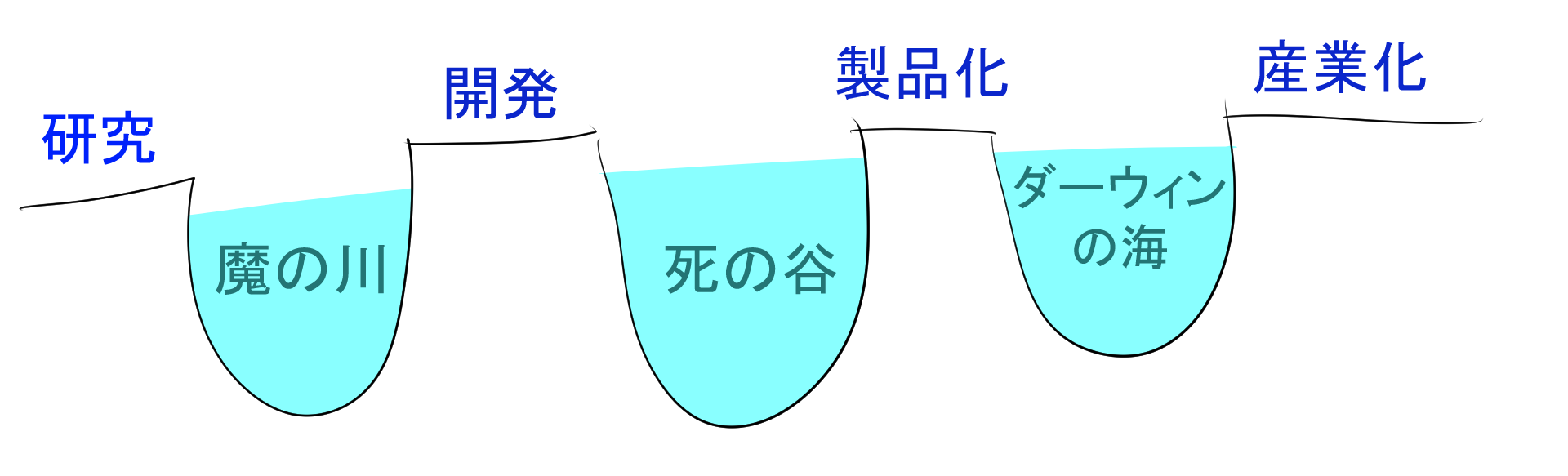 | 死の谷 | 実用化後の事業化段階での資金・市場の壁 | ベンチャーキャピタル、PoC、差別化戦略 |