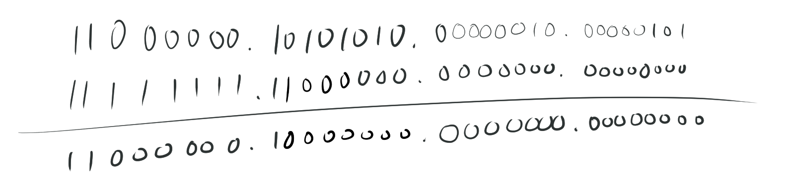一方で、サブネットマスクの2進数表記は11111111.11000000.00000000.00000000となります。