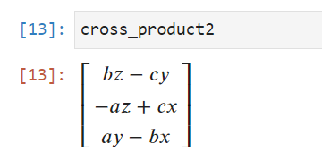このコードは、ベクトル \(\mathbf{v1} = \begin{pmatrix} x \\ y \\ z \end{pmatrix}\) と \(\mathbf{v2} = \begin{pmatrix} a \\ b \\ c \end{pmatrix}\) の外積を計算し、結果を表示します。