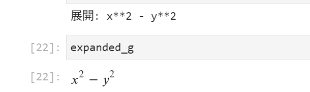 このコードは、多変数の因数分解された式 \( (x – y)(x + y) \) を展開し、結果を表示します。出力は次のようになります。