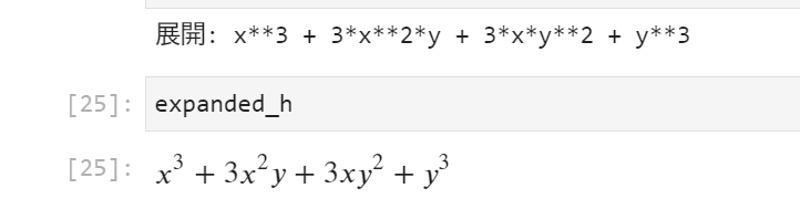 このコードは、複雑な因数分解された式 \( (x + y)^3 \) を展開し、結果を表示します。出力は次のようになります。