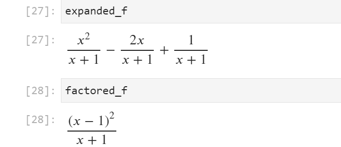このコードは、分数の式 \( \frac{(x – 1)^2}{x + 1} \) を展開し、結果を表示します。出力は次のようになります。