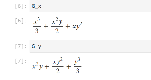 このコードは、関数 \( g(x, y) = x^2 + y^2 + xy \) の \( x \) および \( y \) に関する不定積分を計算します。出力は次のようになります。