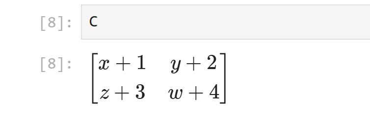 Sympyの強みは、数値だけでなくシンボルを扱える点です。シンボルを使った行列の和を計算してみましょう。