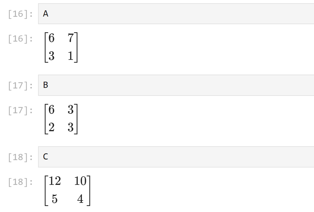 Sympyでは、Matrixを使って行列を作成します。例えば、先ほどの行列 Aと B を以下のように定義できます。