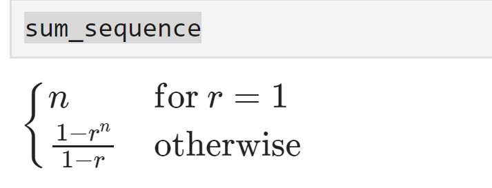 このコードは、等比数列 \( 1 + r + r^2 + \ldots + r^{n-1} \) の和を計算し、結果を表示します。出力は次のようになります。