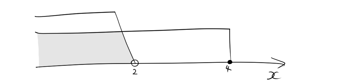 これらを満たす \(x\) は、\(2 < x \leqq 4\) です。解の範囲は次の通りです。 \[ 2 < x \leqq 4 \]