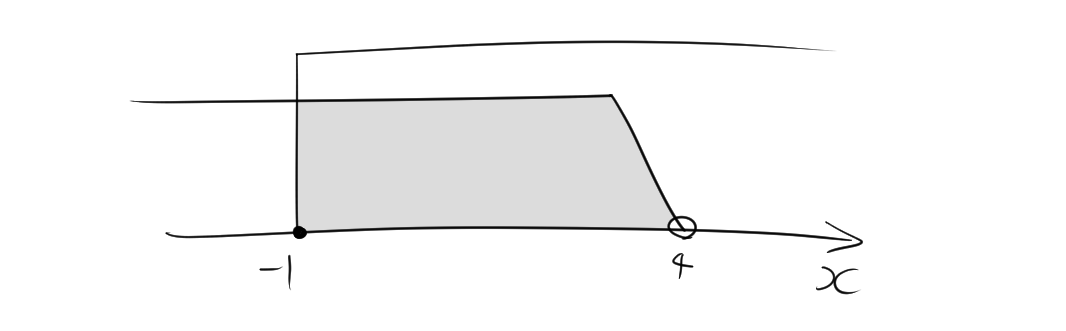これらを満たす解の範囲は、\(-1 \leqq x < 4\) です。この解は数直線上で表すと、次のようになります。